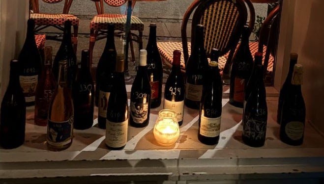 Low amber bulbs hang from their nooses, brick exposed, small marble tables barely big enough for two glasses and on the wall, a large chalkboard that lists obscure natural wines in looping handwriting.